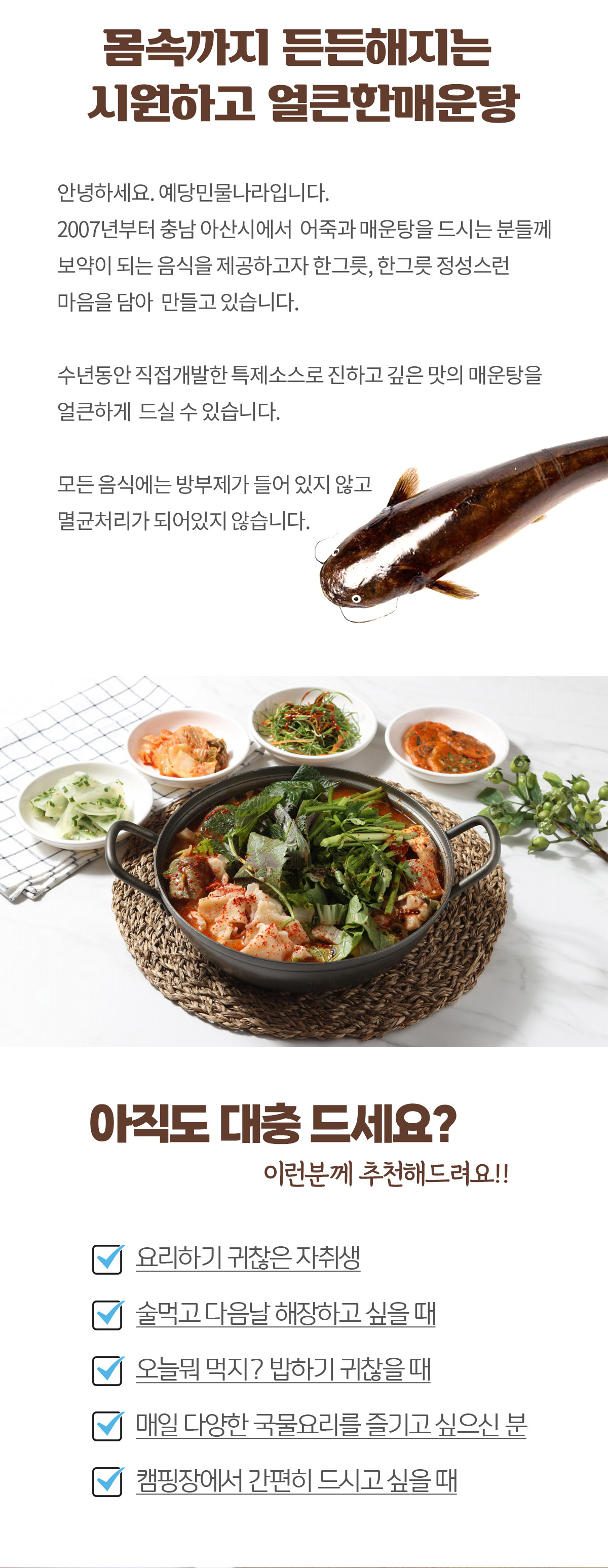 예당저수지에서 공수하여 살이 부드러운 국산 메기 사용